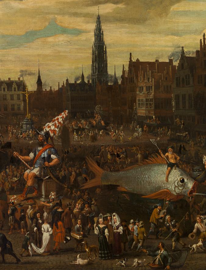 The joyful entrance of a new monarch was a traditional moment to hold the "Ommegang". A threatening giant walked as part of the parade. The message was that the city of Antwerp had often stood up to great Goliath strangers, just like little David. In doing so the city had acquired privileges over the centuries. Antwerp's giant was called Druoon Antigoon.
